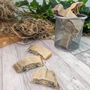 Kuivatut turskan palat ovat 100 % luonnollinen tuote Norjan puhtaista vesistä. Maukas ja ravinteikas lisä kaikenkokoisten koirien ruokavalioon. Se sopii herkuksi, pureskeltavaksi sekä osaksi raakaruokintaa. Tämä monoproteiininen kalaherkku sisältää vain yhtä eläinproteiinia – turskaa – ja on siksi erinomainen vaihtoehto myös herkille koirille. Turskan nahka sisältää luonnostaan runsaasti välttämättömiä omega-3-rasvahappoja ja kollageenia, jotka tukevat sydämen ja aivojen toimintaa sekä ihon ja turkin hyvinvointia. Kalan karkea ja luonnollinen rakenne auttaa myös ylläpitämään suun terveyttä poistamalla hammaskiveä ja plakkia. Tuote on 100 % luonnollinen, eikä sisällä lisä-, säilytys- tai makuaineita – vain puhdasta, ehtaa norjalaista kalaa.